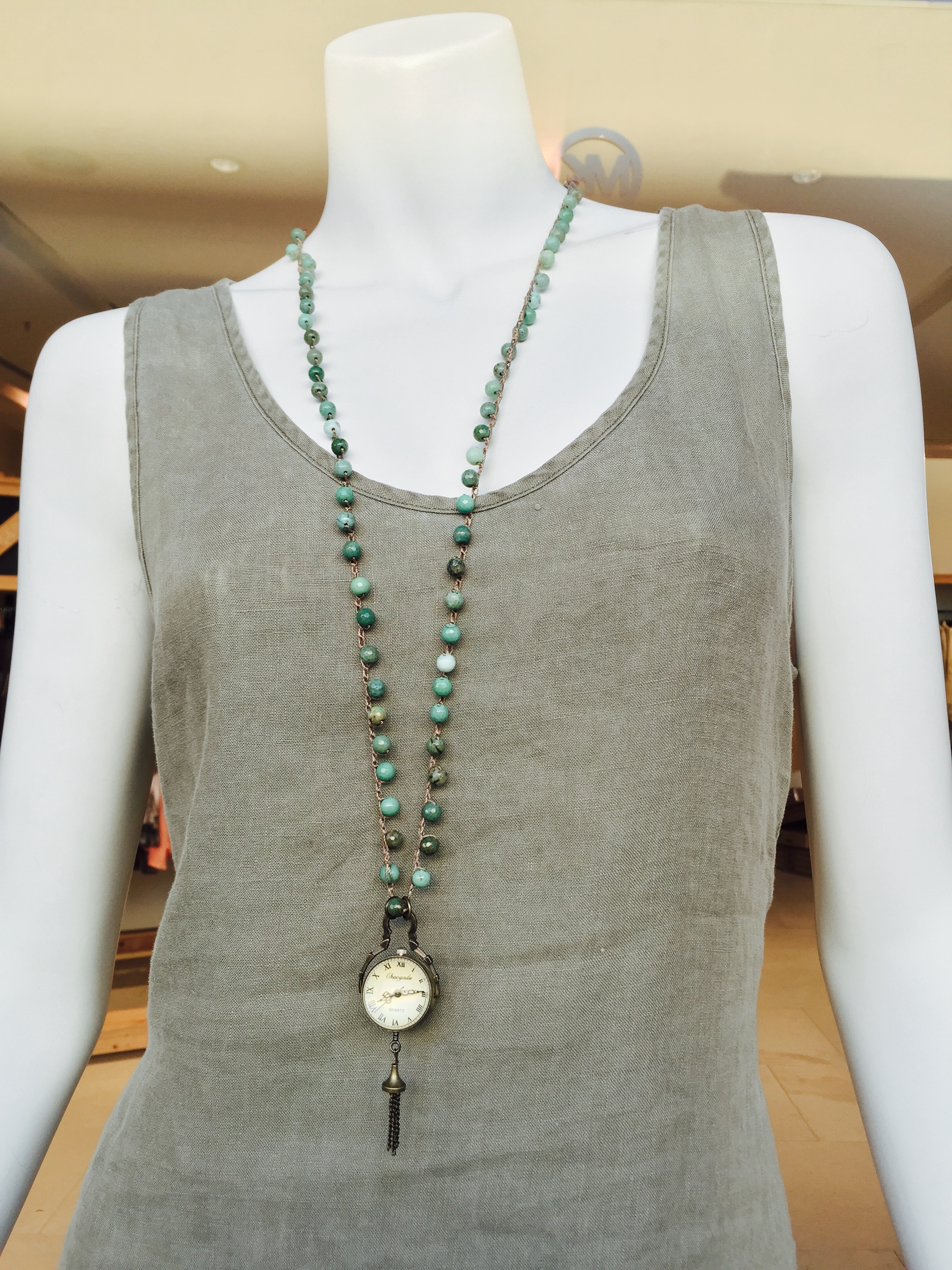 Felicia - Crocheted necklace of moss opal gemstone beads and a brass clock pendant